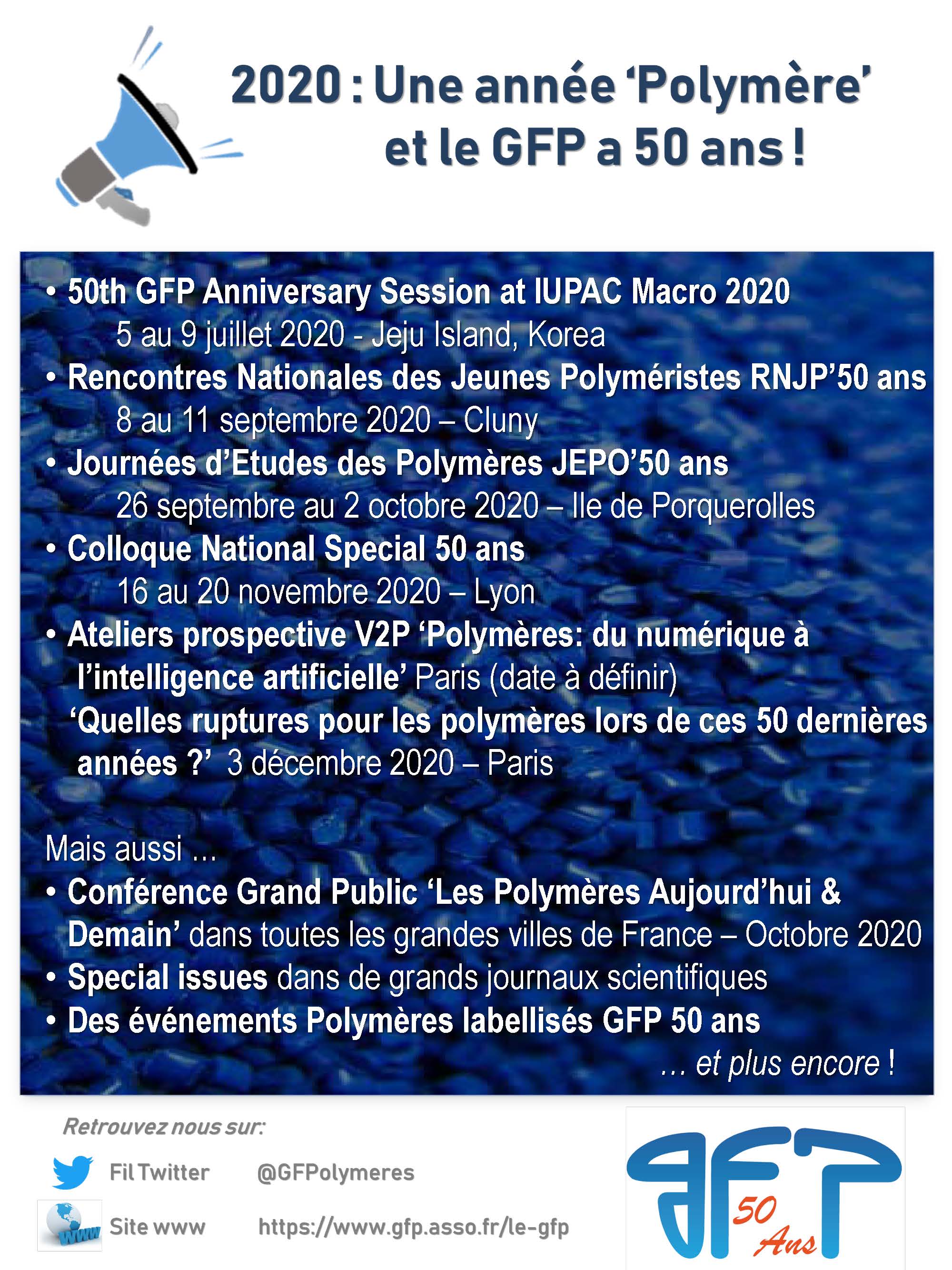 Cette année 2020 sera donc celle des 50 ans du GFP avec de nombreux événements et activités associés aux polymères : conférences grand public sur de nombreux sites, actions de vulgarisation et actions de communication dans différents média, publications dédiées, mise en évidence de la riche vie ‘Polymère’ française à travers la labellisation d’événements y ayant trait, etc.