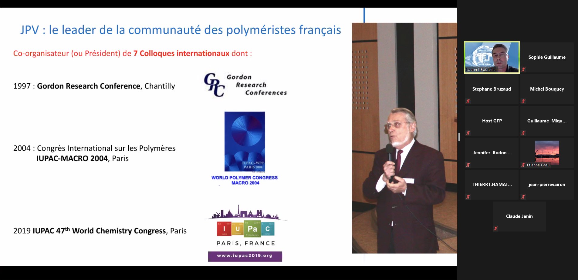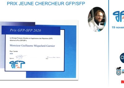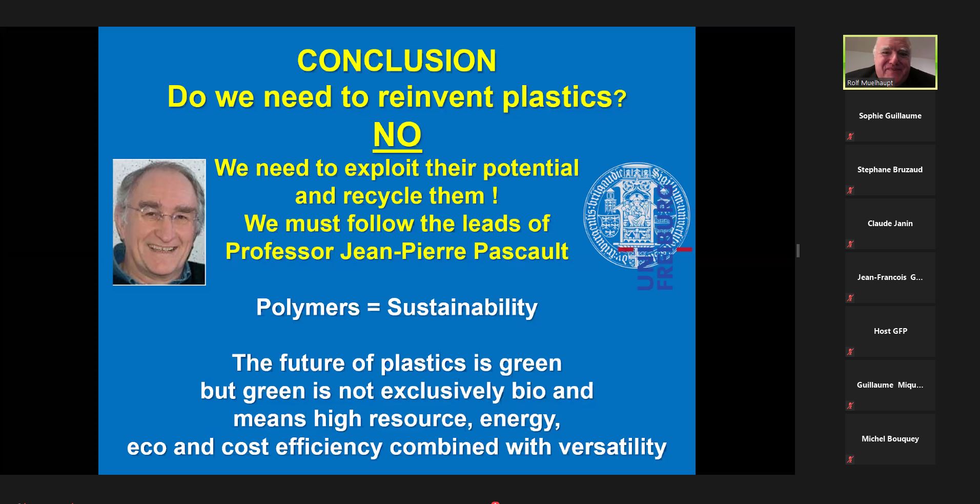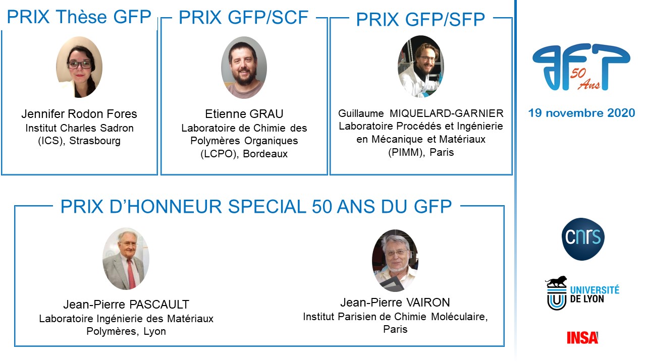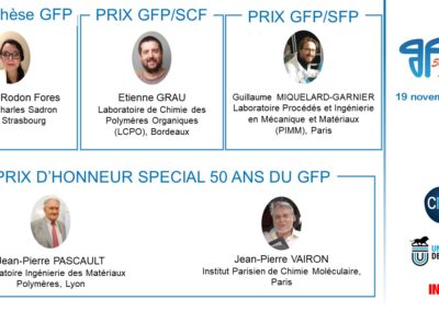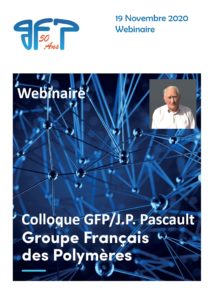 En attendant, le GFP s’est mobilisé pour organiser un mini symposium d’une journée en distanciel. Il se tiendra le 19 novembre prochain. Trois temps forts vont rythmer la journée. Le premier est consacré à un hommage à notre collègue Jean-Pierre Pascault qui nous a quitté cette année mais qui aura marqué durablement notre communauté par son engagement en science macromoléculaire dans son laboratoire comme au sein du GFP*. A l’issue d’un court témoignage de son ami C. Janin, une conférence plénière en son hommage sera donnée par le Prof. MUELHAUPT de l’Université de Freiburg. Le deuxième temps fort, ouvert à tous les participants, est dédié à l’Assemblée Générale de l’association au cours de laquelle un bilan annuel et prospectif sera fait. Enfin, une troisième partie est organisée autour de conférenciers invités, récemment primés d’une part (Prix d’Honneur Spécial 50 ans du GFP,