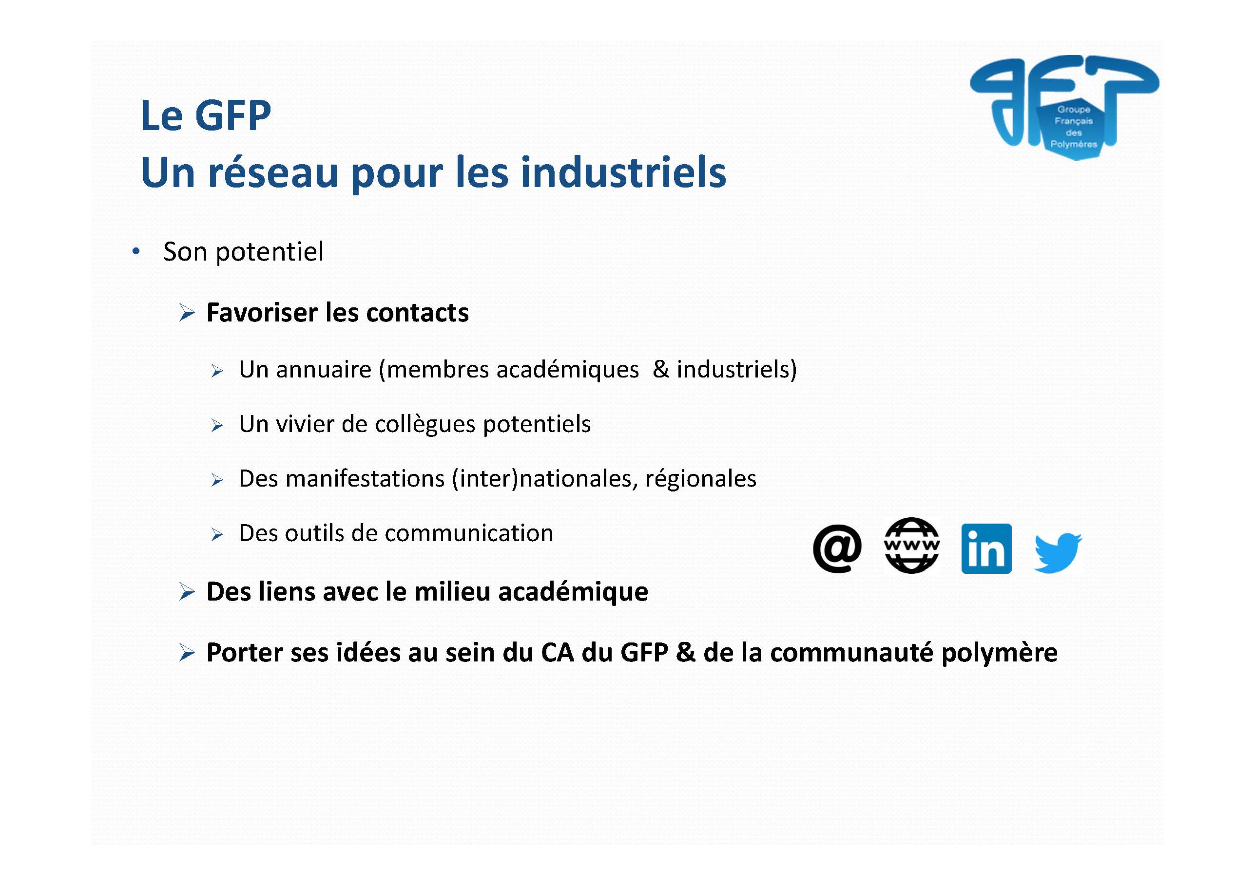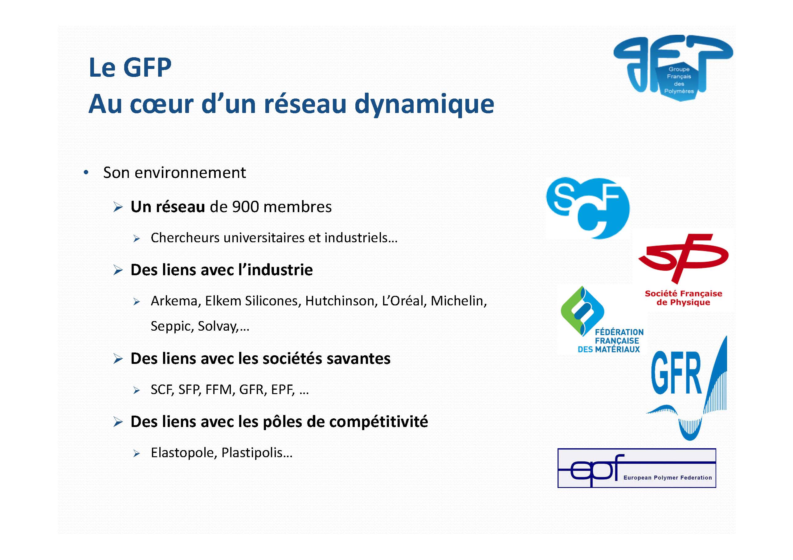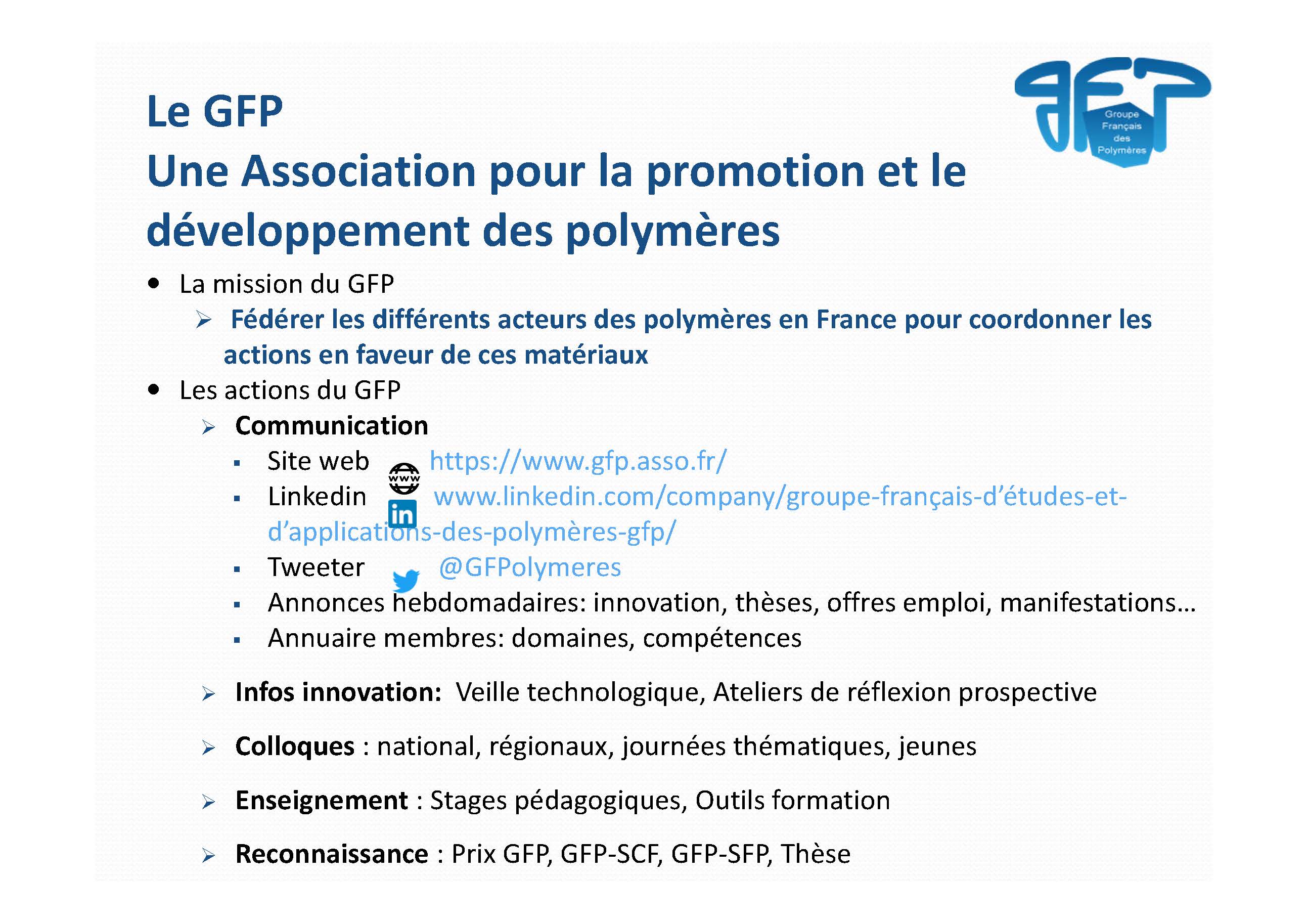 Téléchargez ici la présentation du GFP sur support ppt que vous pourrez utiliser tout ou partie lors de vos présentations scientifiques ou de vos représentations pour le compte du GFP.