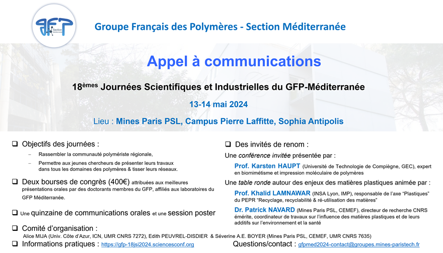 « Tous les Évènements Cet évènement est passé. 18èmes Journées Scientifiques et Industrielles du GFP-Méditerranée 13 mai 2024 - 14 mai 2024 « CNRS thematic school of NMR : structural and dynamic characterization of polymer materials Plasturgie & Environnement // Plastics Industry & Environment 2024 » Ajouter au calendrier Google Agenda iCalendar Outlook 365 Outlook Live Détails Début : 13 mai 2024 Fin : 14 mai 2024 Lieu Mines Paris PSL Campus Pierre Laffitte Sophia Antipolis, France