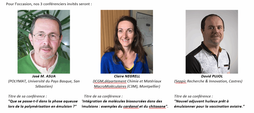 Cet évènement national, qui a lieu tous les ans depuis plus de 39 ans, organisé alternativement par les industriels et les institutions académiques, est l’occasion pour les communautés scientifiques académiques et industrielles travaillant dans les domaines de la polymérisation en émulsion (colloïdes polymères de type latex polymères, latex composites) et de la physico-chimie des tensio-actifs et des formulations à base d’émulsions liquides de se retrouver et d’échanger sur l’avancement des recherches.