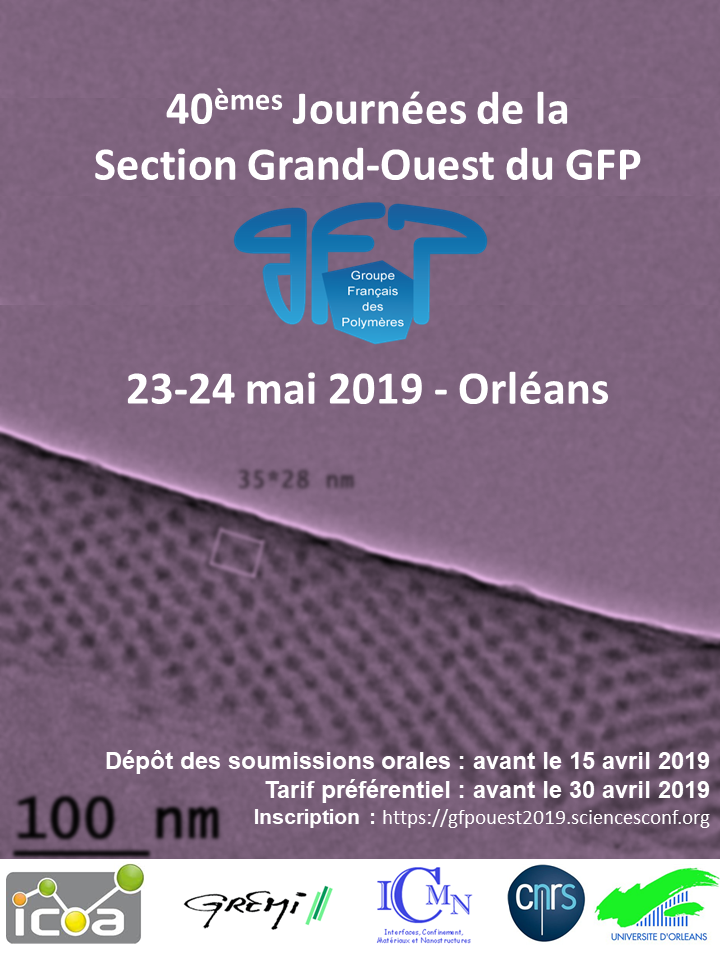 Les 40èmes journées de la Section Grand Ouest du Groupe Français d’Études et d’Applications des Polymères (GFP) se tiendront pour la première fois depuis leur création à Orléans du 23 au 24 mai 2019. Ces journées, se dérouleront sur le site de l’Université d’Orléans et seront co-organisées par l’ICMN, l’ICOA et le GREMI, trois unités mixtes de l’université d’Orléans et du CNRS, dont les activités dans le domaine de la chimie, de la physique, des matériaux et des sciences de l’ingénieur font pour partie appel aux sciences et applications des polymères.