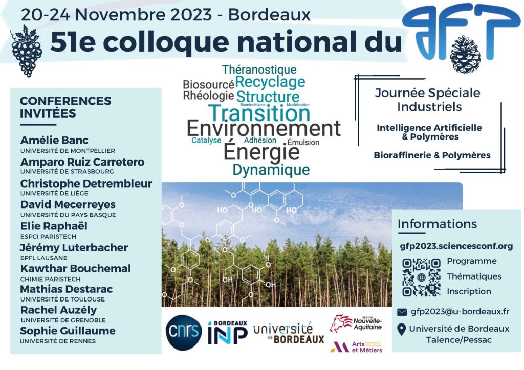 Depuis plus de cinquante ans, le Colloque national du GFP se tient chaque année fin novembre, dans une ville française différente. Le colloque national du GFP réunit traditionnellement 200 à 250 participants. Son programme aborde tous les différents aspects de la science et des applications des polymères. Au cours de la semaine se tient par ailleurs l’assemblée générale du GFP. En 2023, la section Sud-Ouest du GFP qui organise le Colloque national 2023 à Bordeaux a choisi de mettre en lumière les interactions privilégiées avec la communauté des polyméristes espagnols, notamment du Pays Basque qui n’est qu’à 2h de Bordeaux.
