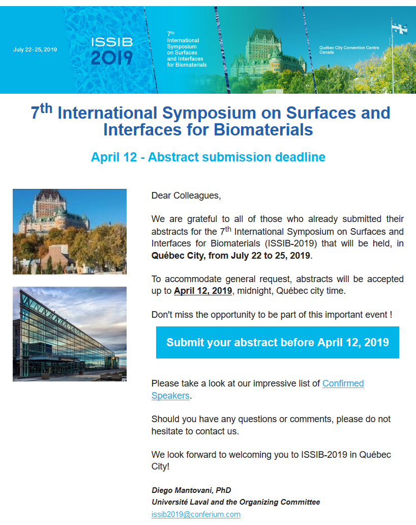 We are grateful to all of those who already submitted their abstracts for the 7th International Symposium on Surfaces and Interfaces for Biomaterials (ISSIB-2019) that will be held, in Québec City, from July 22 to 25, 2019.
