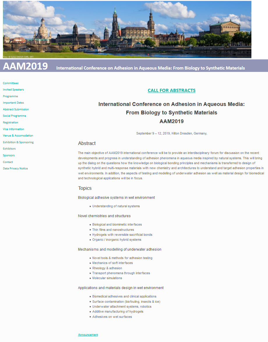 The main objective of AAM2019 international conference will be to provide an interdisciplinary forum for discussion on the recent developments and progress in understanding of adhesion phenomena in aqueous media inspired by natural systems. This will bring up the dialog on the questions how the knowledge on biological bonding principles and mechanisms is transferred to design of synthetic hybrid and multi-response materials with new chemistry and architectures to understand and target adhesion properties in wet environments. In addition, the aspects of testing and modelling of underwater adhesion as well as material design for biomedical and technological applications will be in focus.