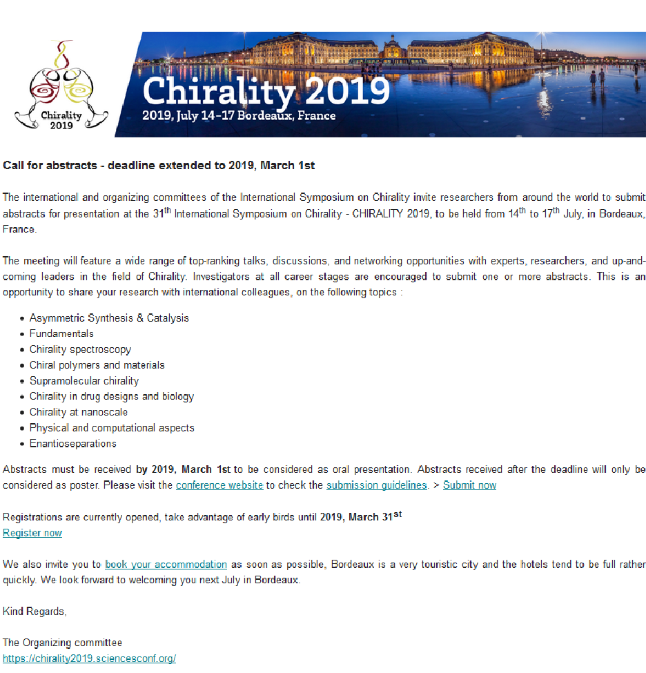 The meeting will feature a wide range of top-ranking talks, discussions, and networking opportunities with experts, researchers, and up-and-coming leaders in the field of Chirality. Investigators at all career stages are encouraged to submit one or more abstracts. This is an opportunity to share your research with international colleagues, on the following topics :