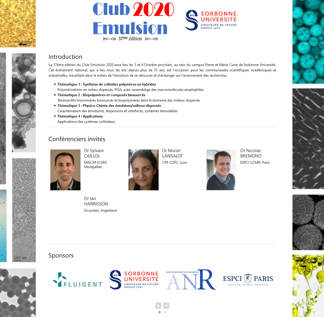 La 37ème édition du Club Emulsion 2020 aura lieu les 5 et 6 Octobre prochain, au sein du campus Pierre et Marie Curie de Sorbonne Université. Cet évènement national, qui a lieu tous les ans depuis plus de 35 ans, est l’occasion pour les communautés scientifiques académiques et industrielles, travaillant dans le milieu de l’émulsion de se retrouver et d’échanger sur l’avancement des recherches.