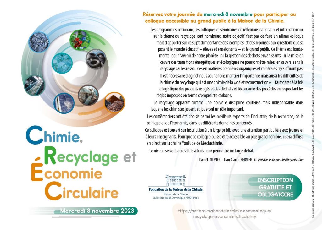 Il est nécessaire d’agir et nous souhaitons montrer l’importance mais aussi les difficultés de la chimie du recyclage qui est une chimie de la « dé et reconstruction » Il faut gérer à la fois la logistique des produits usagés et des déchets et l’économie des procédés en respectant les règles imposées en terme d’empreinte carbone.