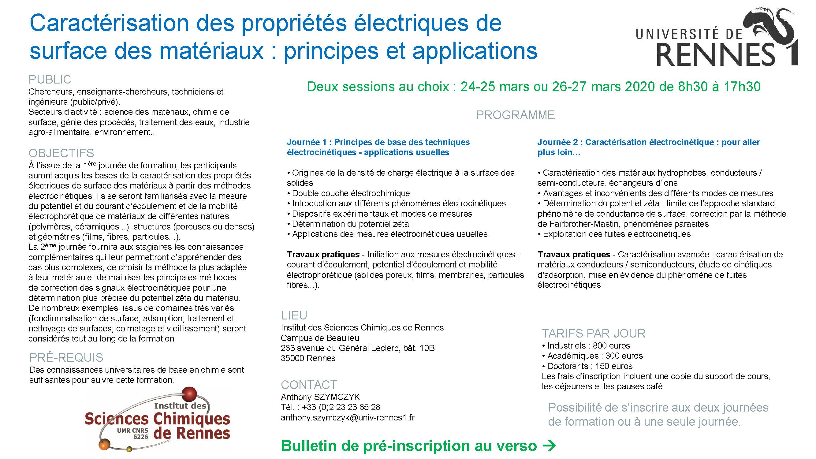 À l’issue de la 1èrejournée de formation, les participants auront acquis les bases de la caractérisation des propriétés électriques de surface des matériaux à partir des méthodes électrocinétiques. Ils se seront familiarisés avec la mesure du potentiel et du courant d’écoulement et de la mobilité électrophorétique de matériaux de différentes natures (polymères, céramiques…), structures (poreuses ou denses) et géométries (films, fibres, particules…).