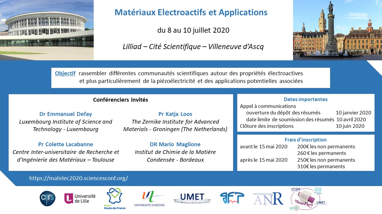 Le colloque « Matériaux Electroactifs et Applications » a pour objectif de rassembler différentes communautés scientifiques ayant pour dénominateur commun les propriétés électroactives et plus particulièrement la piézoélectricité et les applications potentielles associées.