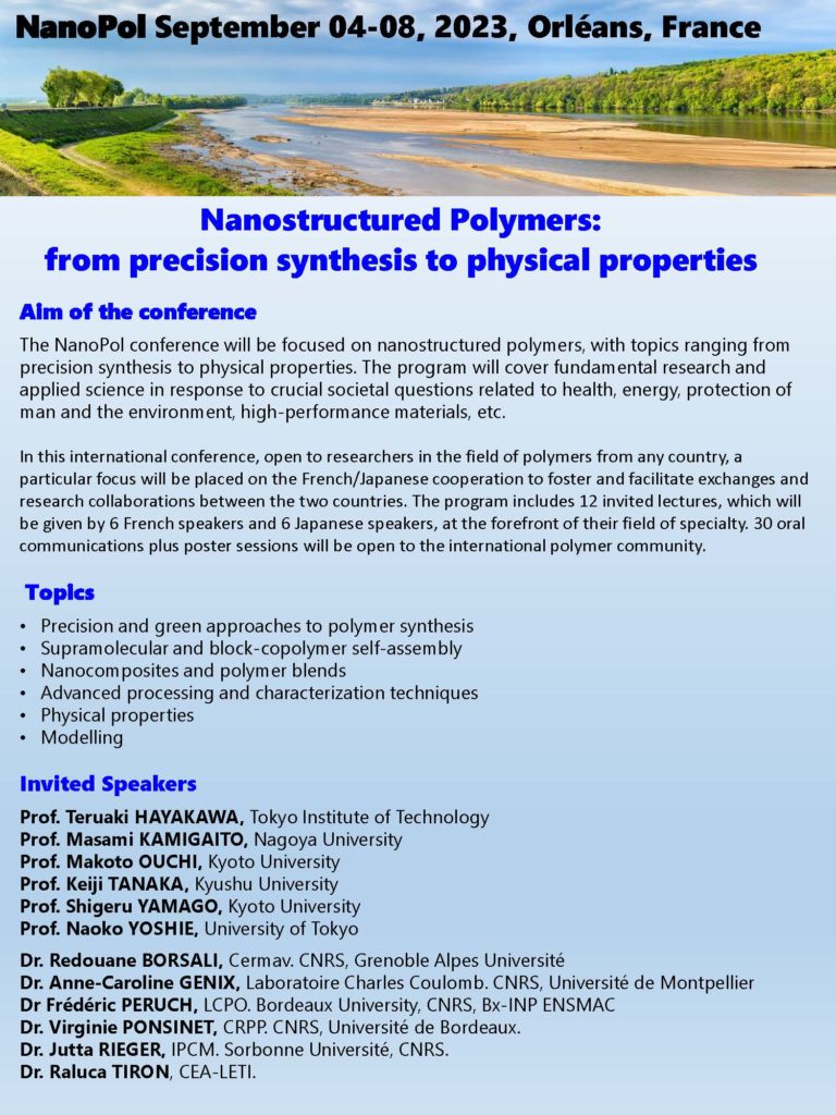 In this international conference, open to researchers in the field of polymers from any country, a particular focus will be placed on the French/Japanese cooperation to foster and facilitate exchanges and research collaborations between the two countries. The program includes 12 invited lectures, which will be given by 6 French speakers and 6 Japanese speakers, at the forefront of their field of specialty. 30 oral communications plus poster sessions will be open to the international polymer community.