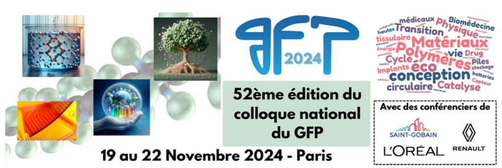 Le Groupe français d’études et d’applications des polymères (GFP) est une société savante qui vise à promouvoir la chimie macromoléculaire, la physique des polymères, et la science des matériaux polymères dans les institutions françaises d’enseignement supérieur et de recherche, mais également au sein du tissu industriel. L’objectif du colloque national est de rassembler la communauté des chercheurs, académiques ou industriels afin de faire le point sur les récentes innovations dans le domaine des polymères. C’est un évènement clé dans la vie du GFP.
