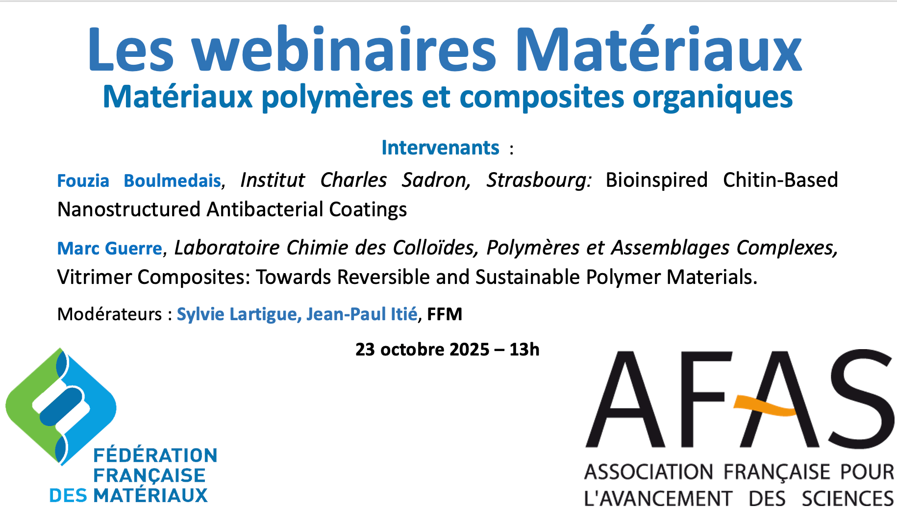 Nous aurons le plaisir d’écouter deux orateurs : Fouzia Boulmedais et Marc Guerre qui nous parlerons respectivement de « Bioinspired Chitin-Based Nanostructured Antibacterial Coatings » et de « Vitrimer Composites: Towards Reversible and Sustainable Polymer Materials”.