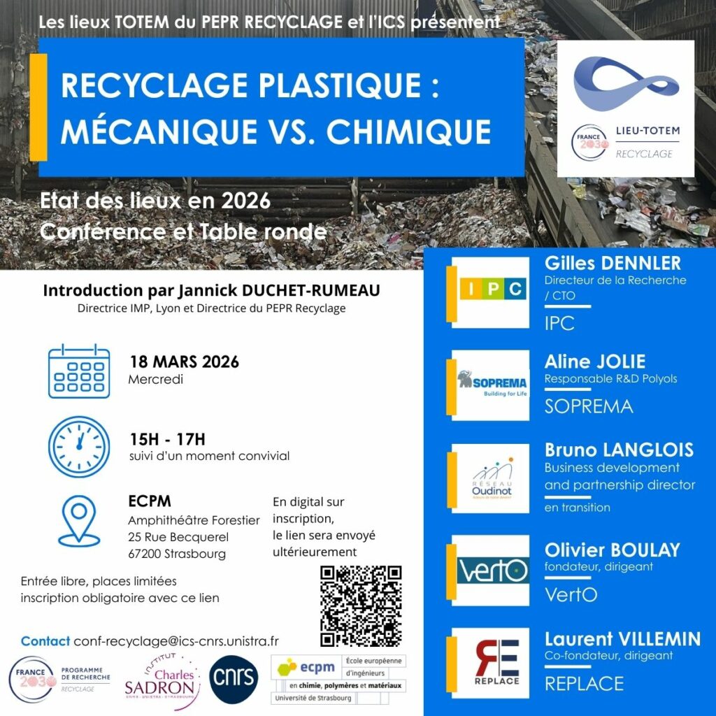 l’Institut Charles Sadron ICS de Strasbourg vous invite à une conférence et table ronde où plusieurs experts et industriels partageront leurs savoirs et expériences sur le thème « recyclage plastique : mécanique vs. chimique ».