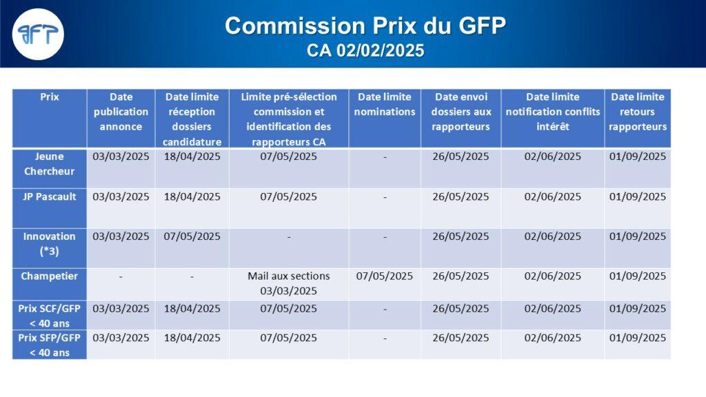 Les dead-lines pour les candidatures pour les prix du GFP 2025 sont étendues au 7 mai. Pour consulter l’ensemble des modalités de participation et les critères de sélection, veuillez vous rendre dans l’onglet « Prix/Distinctions » de notre site, notamment aux adresses suivantes :