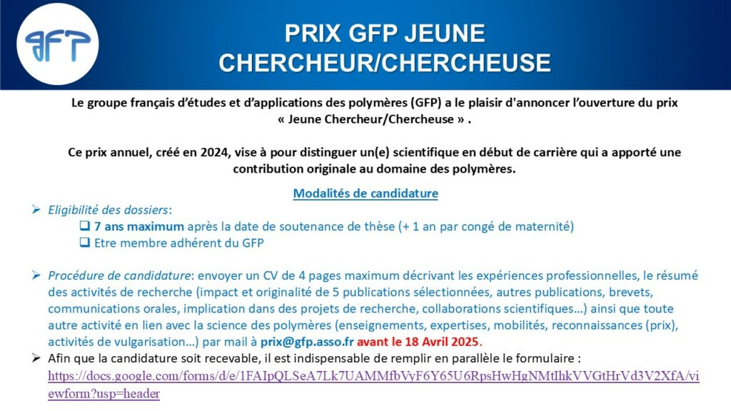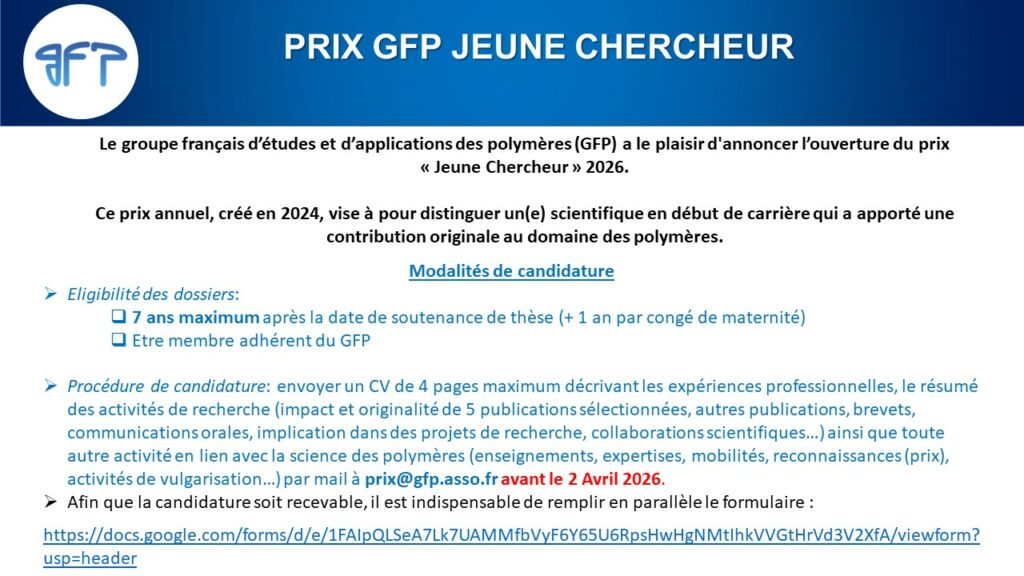 Modalités de candidature. Les candidatures au Prix GFP Jeune Chercheur seront déposées par les postulants eux-mêmes sous la forme d’un CV de 4 pages maximum décrivant les expériences professionnelles, le résumé des activités de recherche (publications, brevets, communications orales,…) ainsi que toute autre activité en lien avec la science des polymères (enseignements, expertises, collaborations, mobilités, reconnaissances et prix,…). Ce dossier devra être transmis par mail à prix@gfp.asso.fr avant la date indiquée dans la communication annuelle de ce prix.