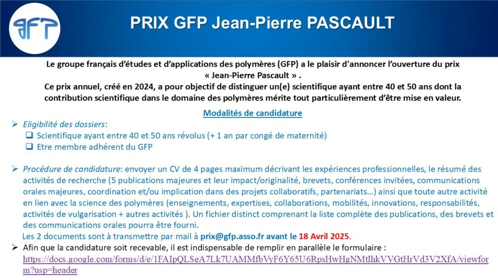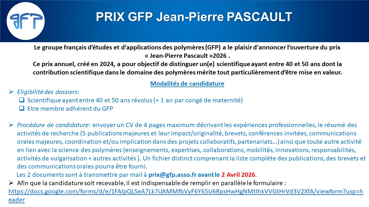 Modalités de candidature. Les candidatures au Prix GFP Jean-Pierre Pascault seront déposées par les postulants eux-mêmes sous la forme d’un CV de 4 pages maximum décrivant les expériences professionnelles, le résumé des activités de recherche (5 publications majeures et leur impact/originalité, brevets, conférences invitées, communications orales majeures, coordination et/ou implication dans des projets collaboratifs, partenariats…) ainsi que toute autre activité en lien avec la science des polymères (enseignements, expertises, collaborations, mobilités, innovations, responsabilités, activités de vulgarisation + autres activités ). Un fichier distinct (annexe) comprenant la liste complète des publications, des brevets et des communications orales pourra être fourni. Le dossier (CV) et le document annexe sont à transmettre par mail à prix@gfp.asso.fr avant la date indiquée dans la communication annuelle de ce prix. Afin que la candidature soit recevable, il est indispensable de remplir en parallèle le formulaire suivant :