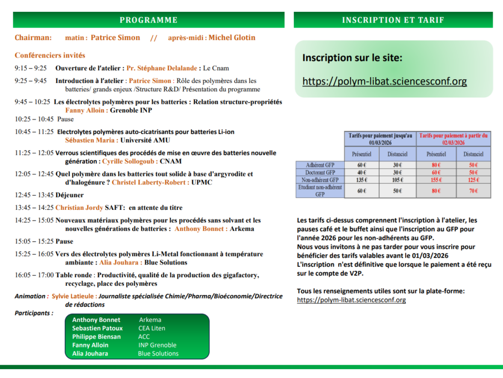 - Faire le point sur les avancées scientifiques: polymères fonctionnels, électrolytes solides, formulation, procédés de mise en œuvre.